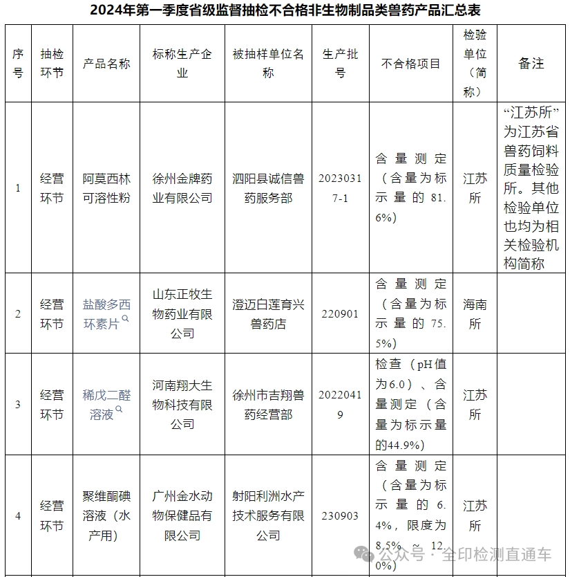 為加強(qiáng)獸藥質(zhì)量監(jiān)管,保障安全用藥,根據(jù)《2024年獸藥質(zhì)量監(jiān)督抽檢和風(fēng)險(xiǎn)監(jiān)測(cè)計(jì)劃》安排,我部組織對(duì)獸藥生產(chǎn)、經(jīng)營(yíng)和使用單位進(jìn)行獸藥質(zhì)量監(jiān)督抽檢,同時(shí)對(duì)日常監(jiān)管中發(fā)現(xiàn)存在風(fēng)險(xiǎn)隱患生產(chǎn)企業(yè)的相關(guān)獸藥產(chǎn)品進(jìn)行跟蹤檢驗(yàn)?,F(xiàn)將2024年第一季度監(jiān)督抽檢有關(guān)情況通報(bào)如下。一、總體情況獸用生物制品部級(jí)監(jiān)督抽檢4批,不合格0批;非生物制品類獸藥產(chǎn)品省級(jí)監(jiān)督抽檢981批,不合格9批(詳見附件)。獸藥質(zhì)量監(jiān)督抽檢結(jié)果