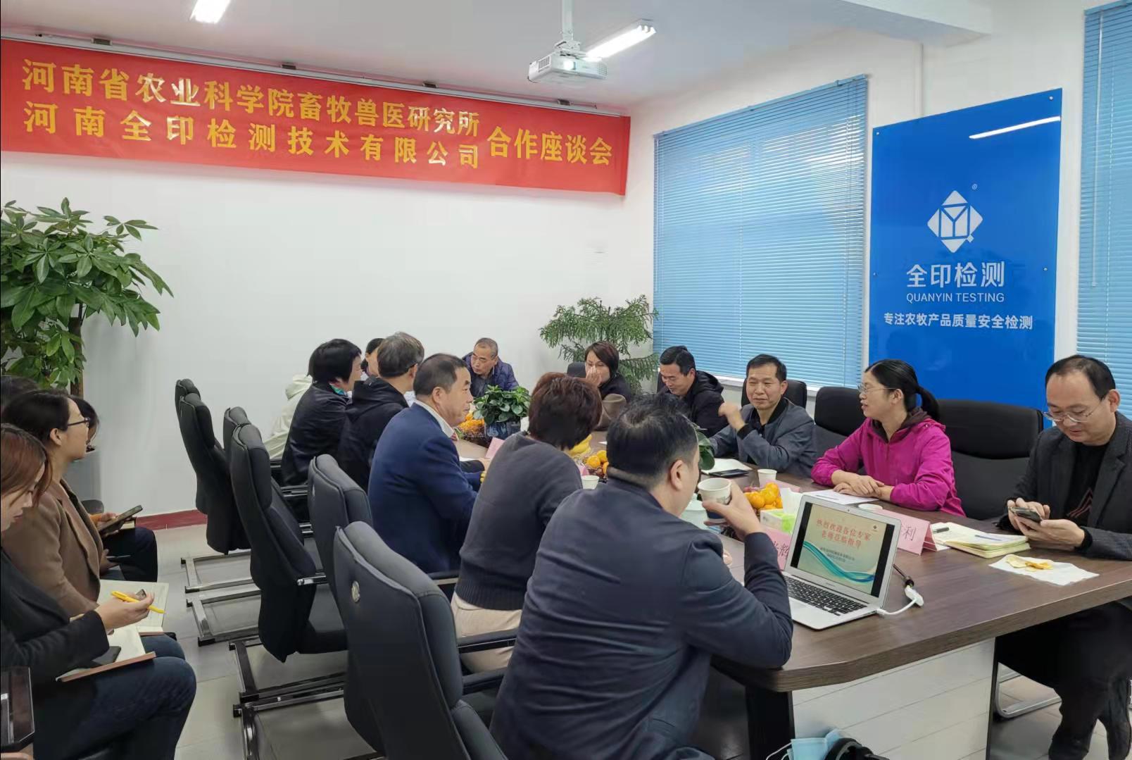 2021年11月1日下午,河南全印檢測(cè)技術(shù)有限公司與河南省農(nóng)業(yè)科學(xué)院畜牧獸醫(yī)研究所獸醫(yī)研究室合作座談會(huì)在全印檢測(cè)公司會(huì)議室舉行。畜牧獸醫(yī)研究所獸醫(yī)研究室主任王克領(lǐng)研究員、張立憲研究員、郎利敏博士、李海利博士、方劍玉博士、張青嫻老師、游一老師、鄭萬(wàn)錄老師蒞臨公司參加會(huì)議。全印檢測(cè)董事長(zhǎng)付立亭、總經(jīng)理李金榮、質(zhì)量負(fù)責(zé)人陳文教授及技術(shù)負(fù)責(zé)人張春霞教授、常選妞教授及員工代表出席了會(huì)議。全印檢測(cè)董事長(zhǎng)付立亭